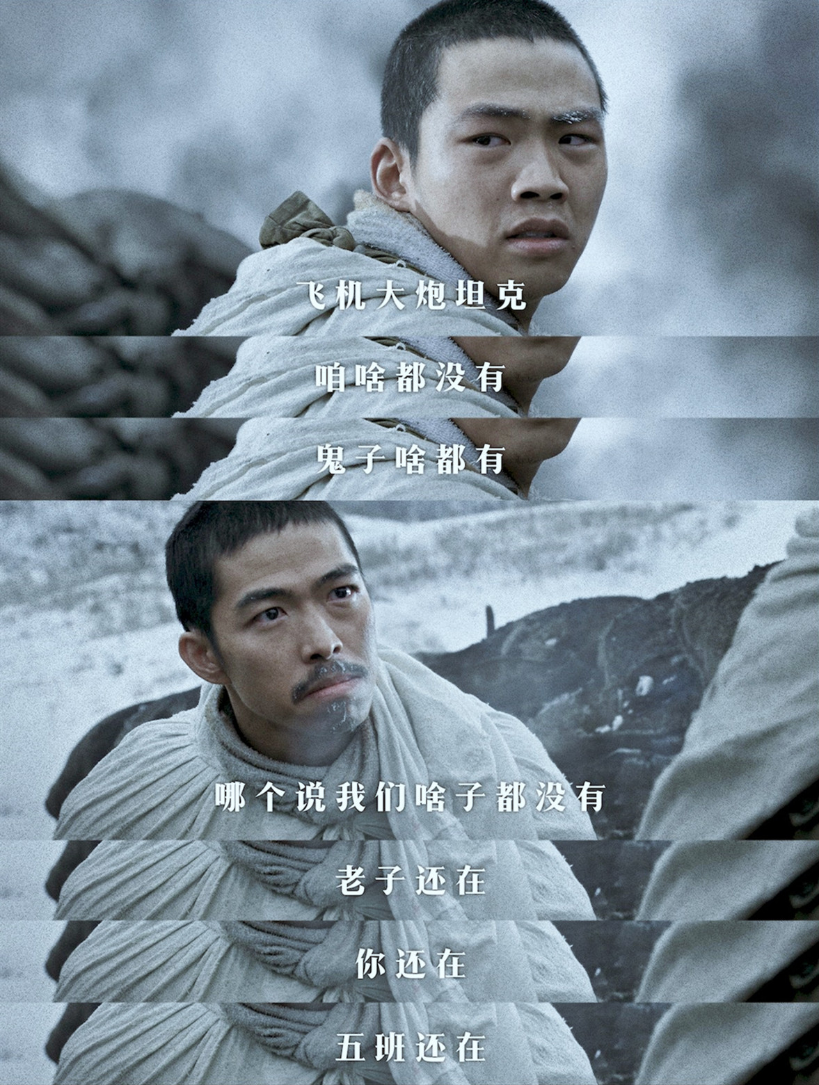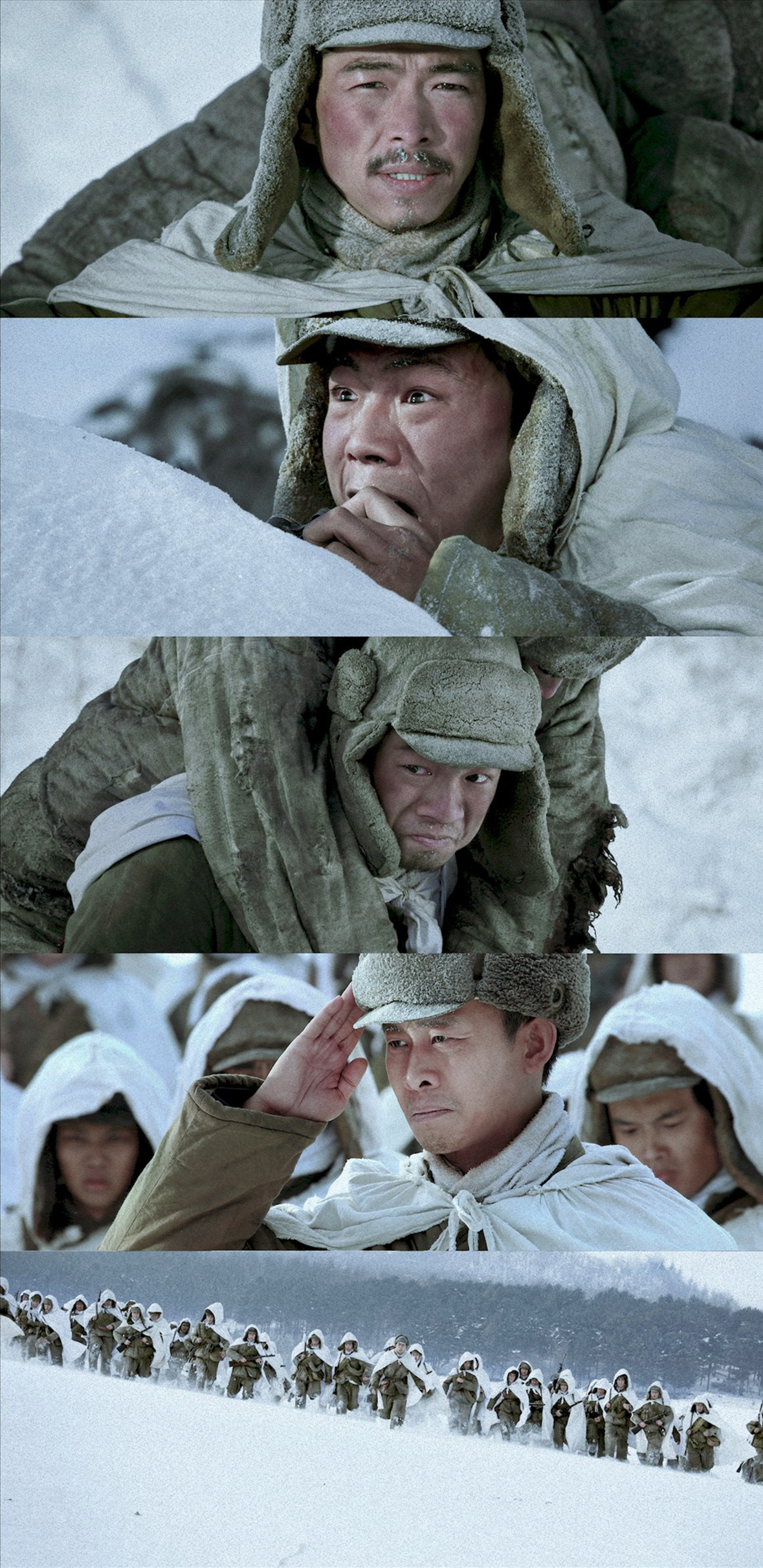 这部电影的场景相当集中,一个雪地,两方士兵,几杆枪外加一些武器就组成了整部电影,虽然没有宏大的背景,没有视听特效,但是小场景里面却蕴藏着伟大的情怀,电影没有选择用几千上万人来营造气势,没有选择飞机炮弹轮番轰炸来强调战争的残酷,只是选择了一个很小的战场,用极其克制的语言在讲述着故事,但是在这份克制中,迸发出的情感是强烈的,是震撼人心的,小场景能展现出和大场面不一样的残酷,大场景里,我们看到的是火光四射,尸横遍野,是耳边不断响起的爆炸声,但在这样的微小场景里,烈士们一个一个的牺牲能让观众更加直观的体会到战争的残酷,也使内心那份爱国情怀久久回荡。