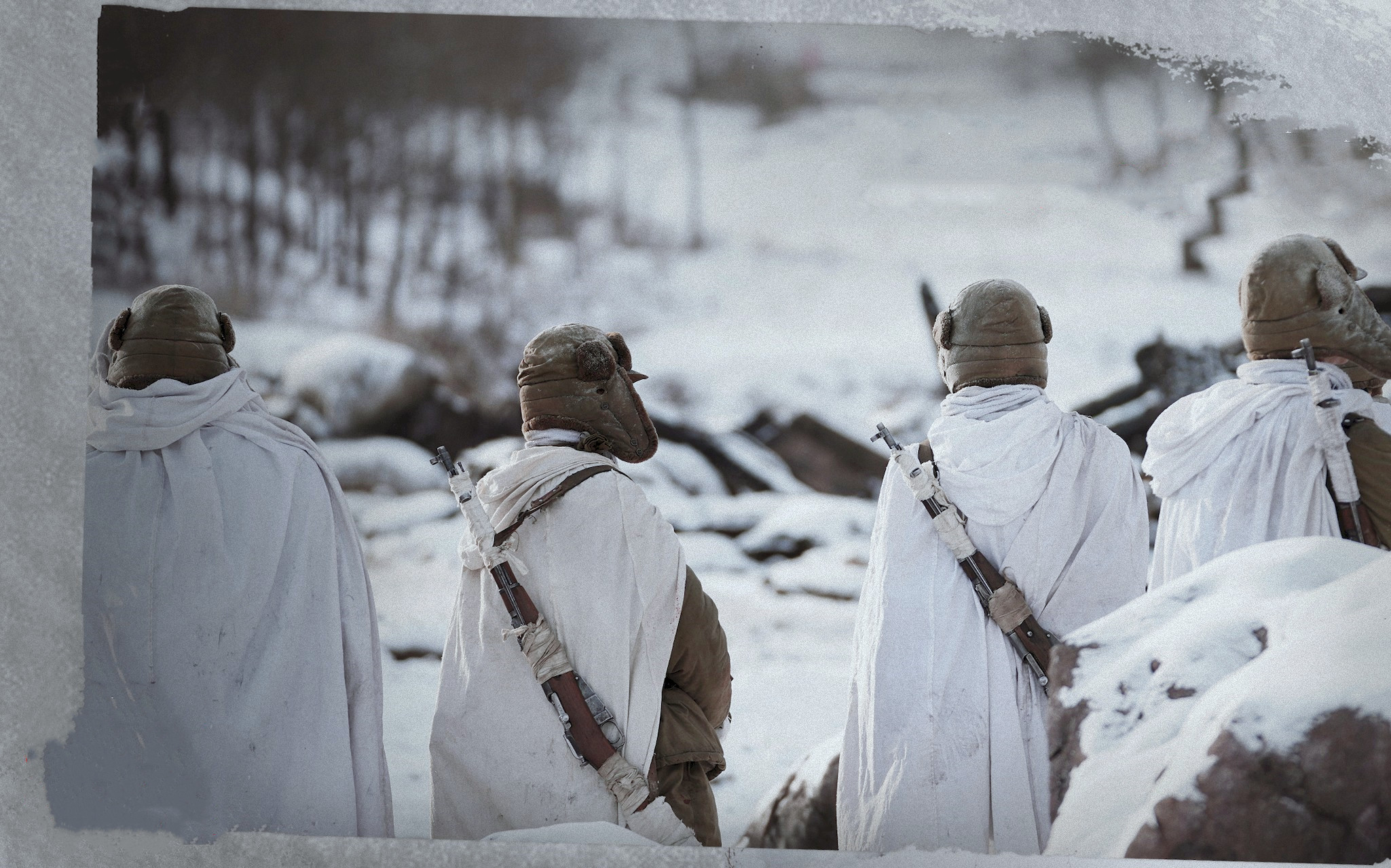 白色之外就是随处可见的黑色以及志愿军的绿色军装,颜色不多,但是区分足够清晰,敌军物质上的充足和志愿军物质上的匮乏显而易见,战场上的残酷也在一片雪白的映衬下带来更大的冲击。